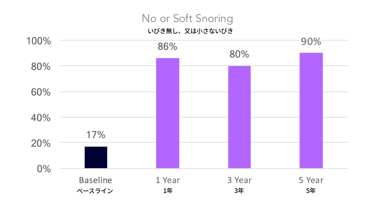 ベースライン時における家族等の17%であるのと比較して、家族等の90%が、患者さんのいびきが弱くなった、または全く無くなったと報告しました。(図 4)